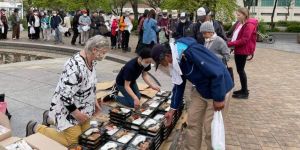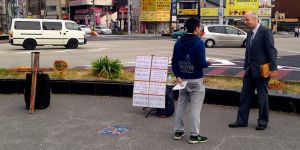 Knut Topland and his team are ministering to homeless people in central Nagoya. They have an outside church service near Oasis 21 on every first and every third Saturday in the month. After the service, they distribute bento boxes and talk with the people who have attended.